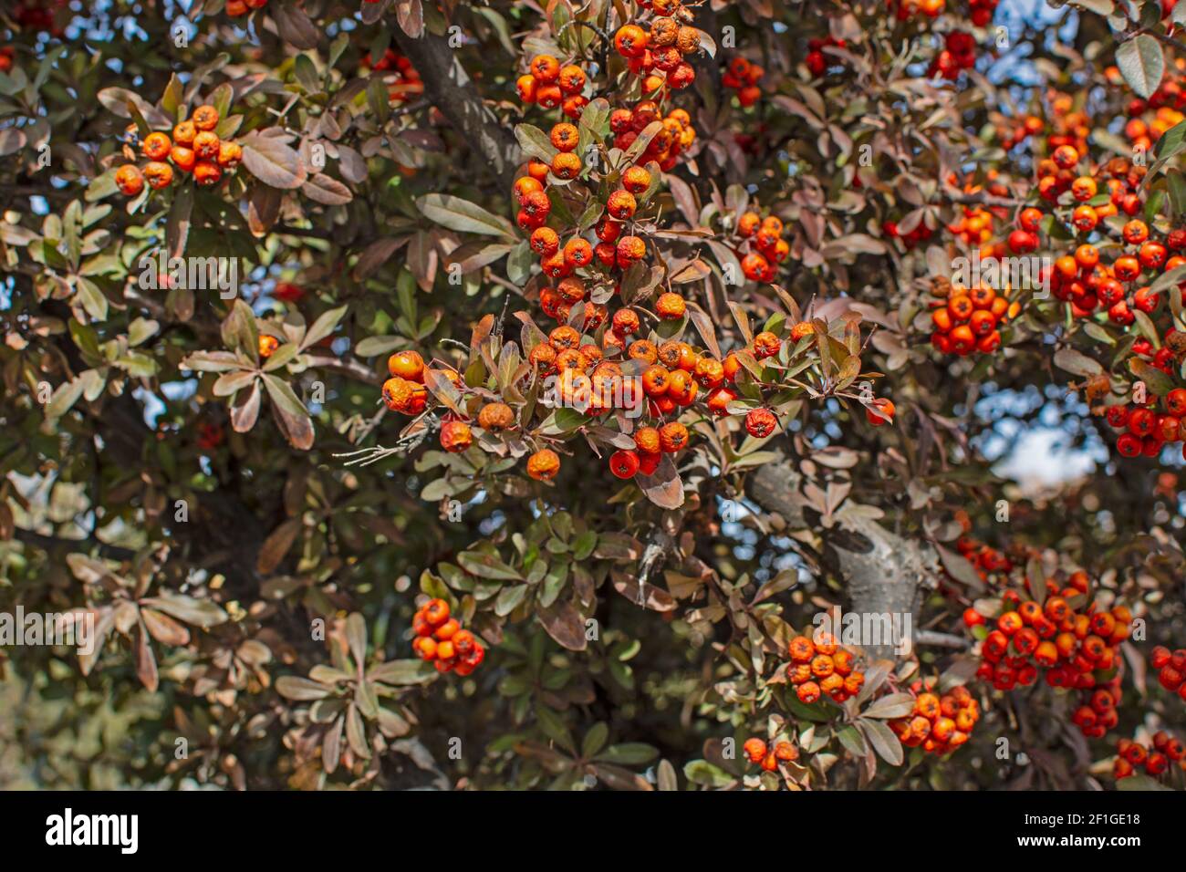 Low-growing Pyracantha coccinea Lowboy Scarlet Firethorn is a thorny evergreen shrub of spreading habit with glossy oval dark green leaves. Size of the orange berries. An orange trees thorns are highly modified twigs.